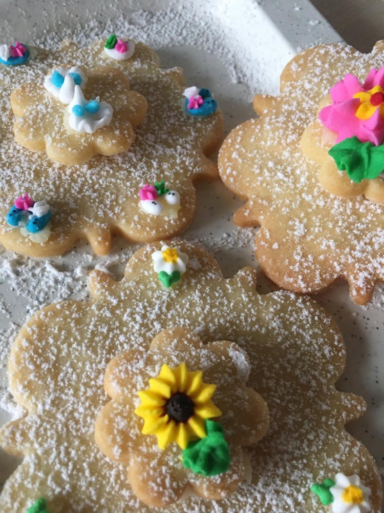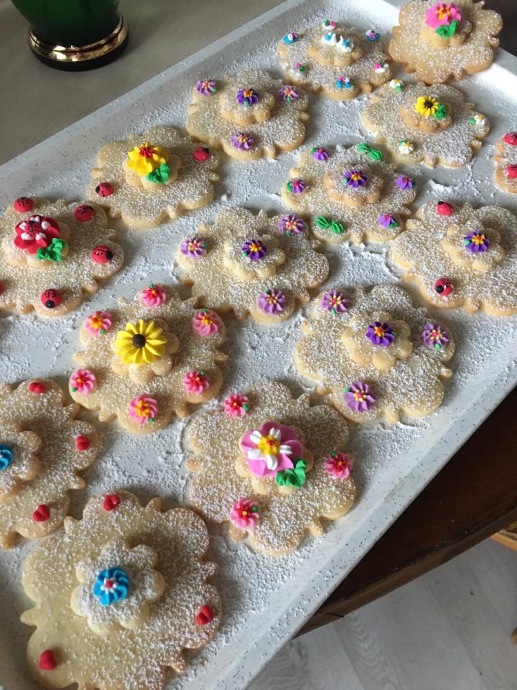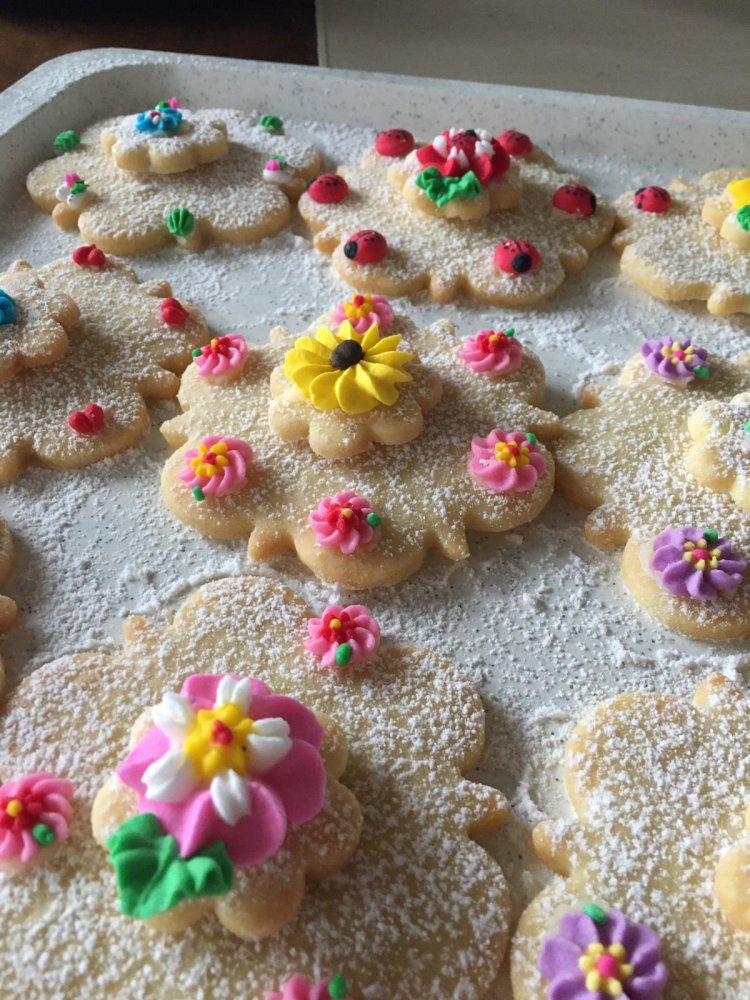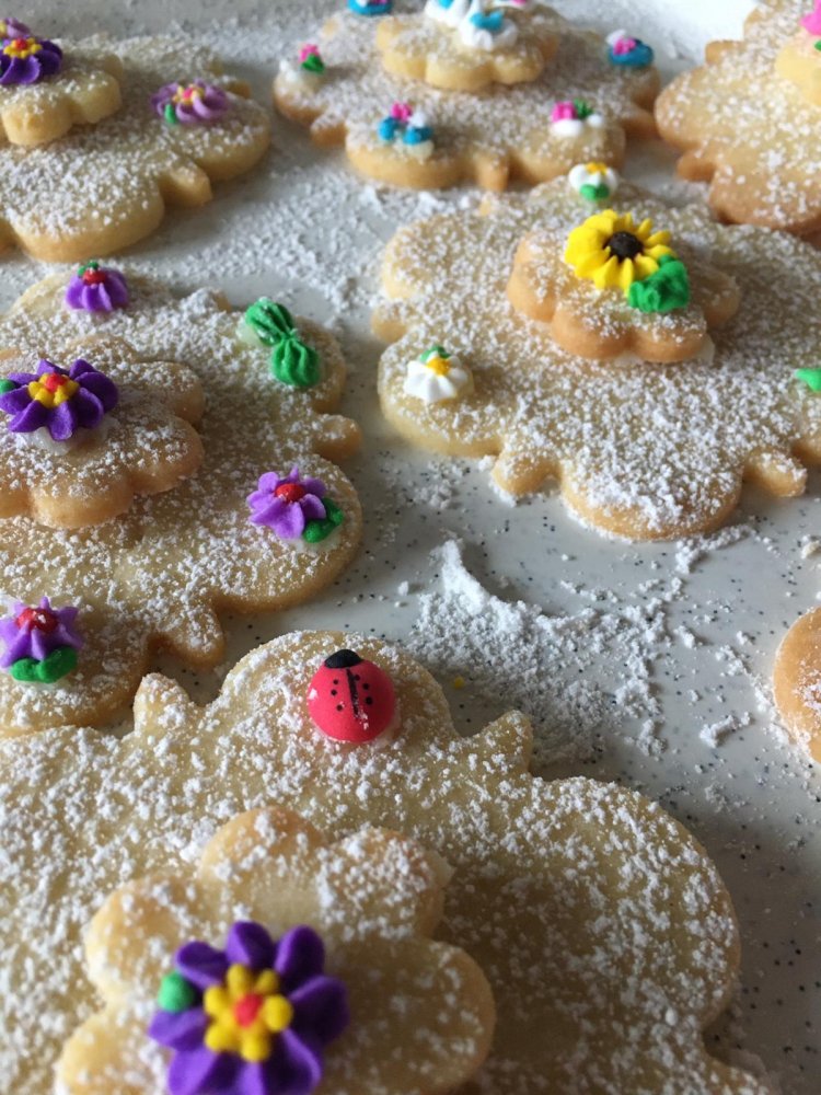 Toto jsou vykrajované hnětýnky z cukru, másla a vajec, zdobené barevnou cukrovou ozdobou.