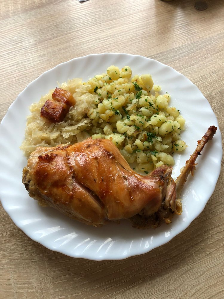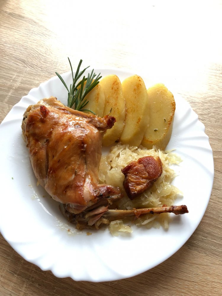 Králík prošpikovaný Pancettou, pečený s kouskem bůčku a s bylinkami - rozmarýnem a snítkem tymiánu, příloha kyselé zelí a bramborový knedlík a druhá varianta špecle.